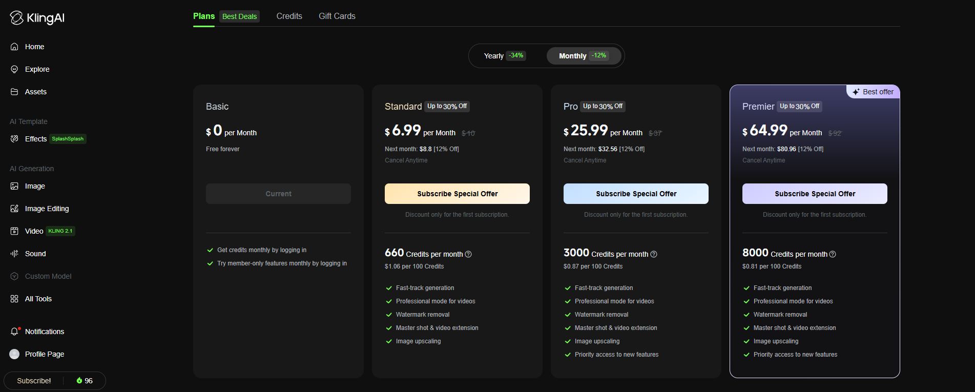 - Premier ($64.99/월): 8000 크레딧, 광고·상업용 영상 제작자용